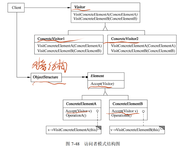 - 结构: - 访问者(Visitor):声明对对象结构中每个元素的访问操作,操作名和参数标识元素类型。