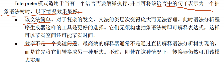 | 解释器模式 | 定义语言文法表示,用解释器解释语言句子 | 抽象表达式、终结符表达式、非终结符表达式、上下文、客户端 | 语言文法简单;需解释执行的句子数量有限;需扩展文法 | |