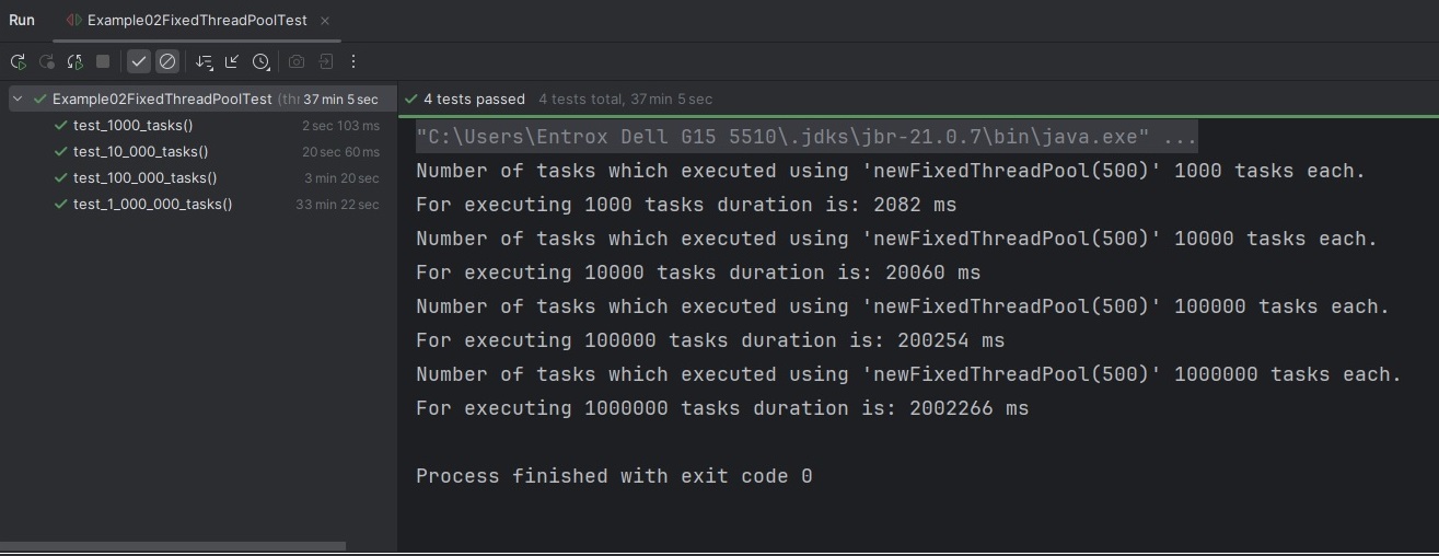 public class Example02FixedThreadPoolTest {@Test@Order(1)public void test_1000_tasks() {Example02FixedThreadPool example02FixedThreadPool = new Example02FixedThreadPool();example02FixedThreadPool.executeTasks(1000);}@Test@Order(2)public void test_10_000_tasks() {Example02FixedThreadPool example02FixedThreadPool = new Example02FixedThreadPool();example02FixedThreadPool.executeTasks(10_000);}@Test@Order(3)public void test_100_000_tasks() {Example02FixedThreadPool example02FixedThreadPool = new Example02FixedThreadPool();example02FixedThreadPool.executeTasks(100_000);}@Test@Order(4)public void test_1_000_000_tasks() {Example02FixedThreadPool example02FixedThreadPool = new Example02FixedThreadPool();example02FixedThreadPool.executeTasks(1_000_000);}}
