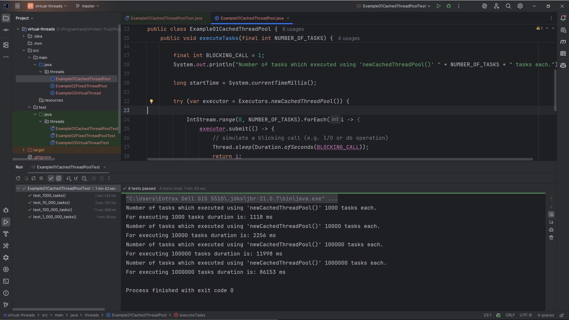 public class Example01CachedThreadPoolTest {@Test@Order(1)public void test_1000_tasks() {Example01CachedThreadPool example01CachedThreadPool = new Example01CachedThreadPool();example01CachedThreadPool.executeTasks(1000);}@Test@Order(2)public void test_10_000_tasks() {Example01CachedThreadPool example01CachedThreadPool = new Example01CachedThreadPool();example01CachedThreadPool.executeTasks(10_000);}@Test@Order(3)public void test_100_000_tasks() {Example01CachedThreadPool example01CachedThreadPool = new Example01CachedThreadPool();example01CachedThreadPool.executeTasks(100_000);}@Test@Order(4)public void test_1_000_000_tasks() {Example01CachedThreadPool example01CachedThreadPool = new Example01CachedThreadPool();example01CachedThreadPool.executeTasks(1_000_000);}}