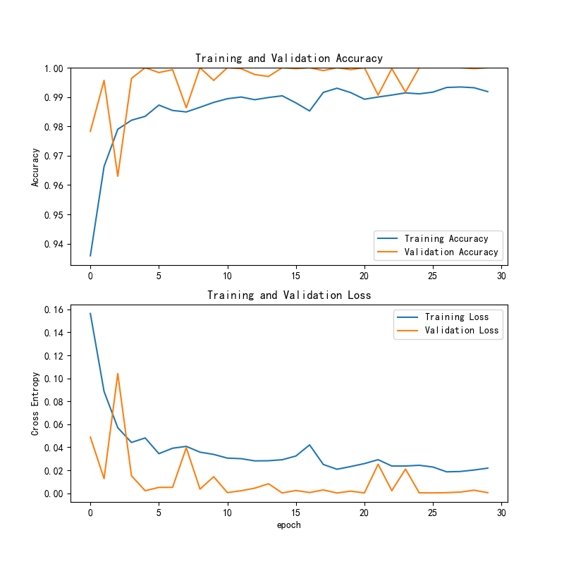 训练与验证曲线显示,模型准确率快速接近 100%,并在训练过程中收敛迅速,验证集表现与训练集相似,未出现过拟合,具有良好的泛化能力。训练损失快速下降并保持低水平,验证损失约为 0.01 以下,表明模型在未知数据上也表现优秀。