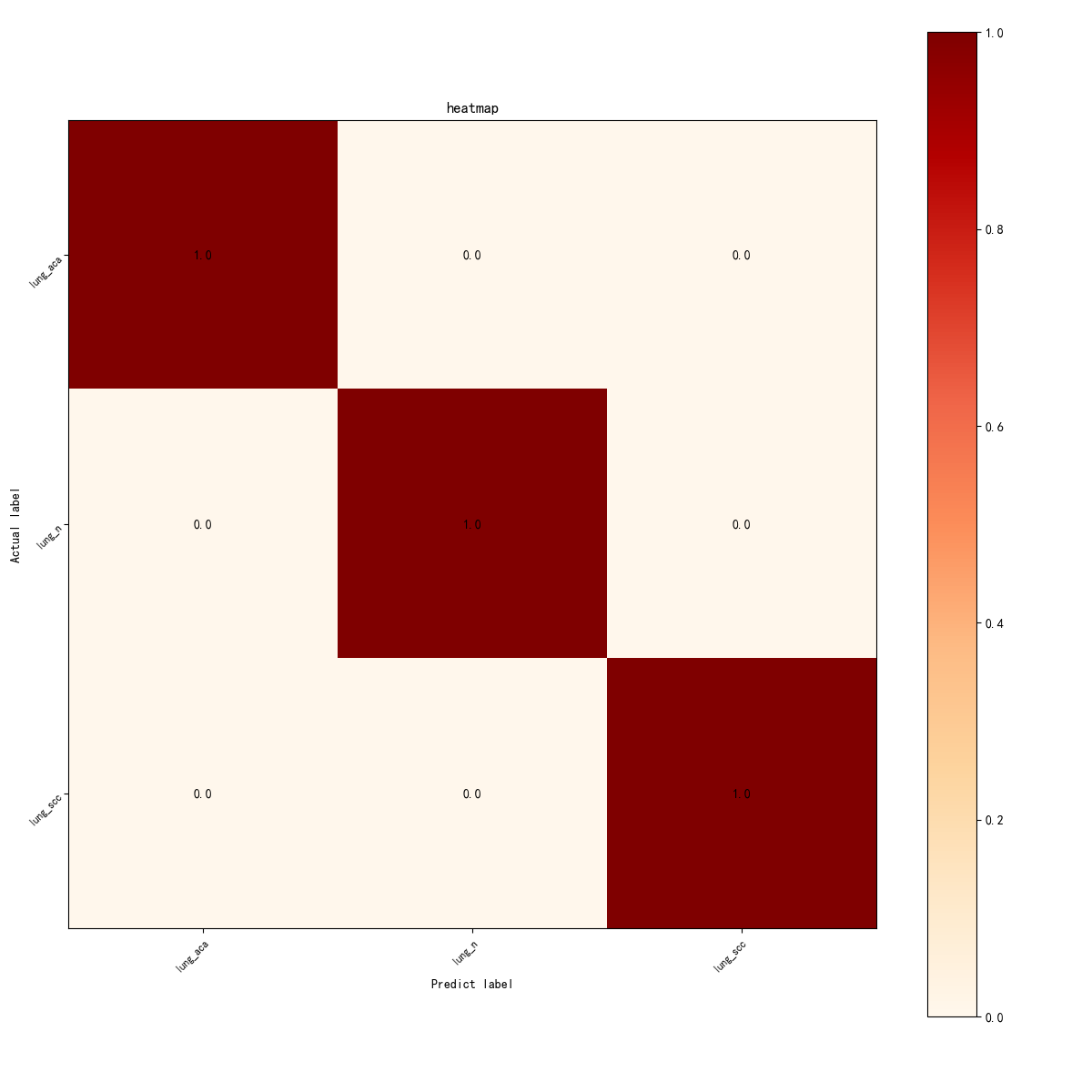 混淆矩阵图显示,模型在所有类别上的预测均为 1.0,对角线元素无误,表明每个类别的预测完全准确。肺腺癌、良性肺组织和肺鳞状细胞癌的样本都被正确分类,进一步证明了模型的高精度和鲁棒性,几乎没有分类错误。