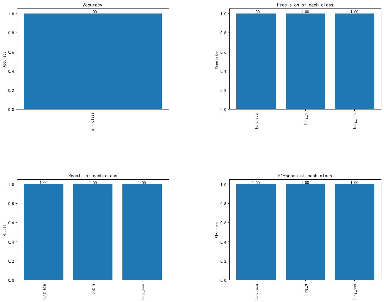分类性能指标图显示,模型在每个类别上的表现非常优秀,整体准确率达到100%。各类别的精确率、召回率和F1-score均为1.00,表明模型对肺腺癌、良性肺组织和肺鳞状细胞癌的预测完全准确,没有假阳性或假阴性,能够有效地区分各类病理图像。