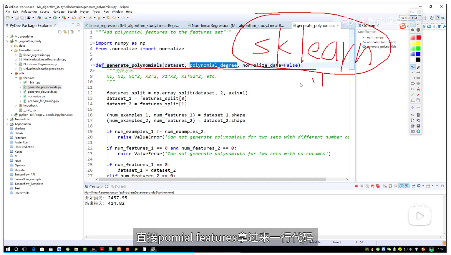 这里展示的是多特征的一个非线性回归的拟合过程,其中polynomial feature多项式特征,是一个可以直接从Sklearn调用的方法,不用手搓