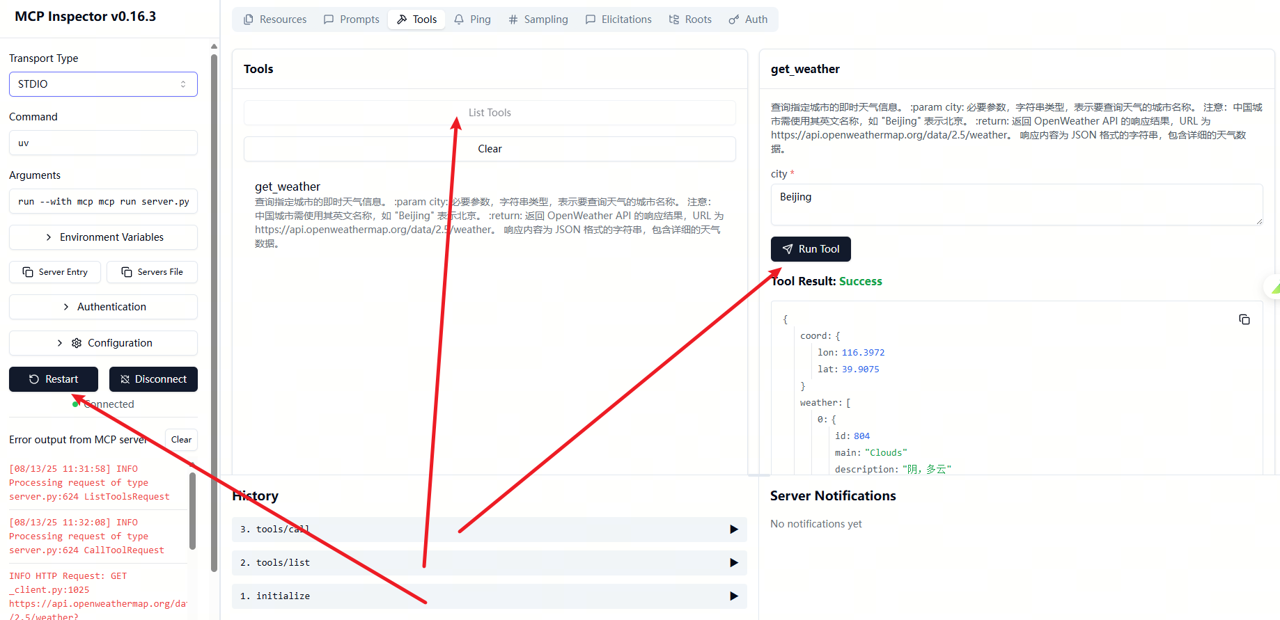 async def get_weather(city: str) -> dict[str, Any] | None:"""查询指定城市的即时天气信息。:param city: 必要参数,字符串类型,表示要查询天气的城市名称。注意:中国城市需使用其英文名称,如 "Beijing" 表示北京。:return: 返回 OpenWeather API 的响应结果,URL 为https://api.openweathermap.org/data/2.5/weather。响应内容为 JSON 格式的字典,包含详细的天气数据;如果请求失败则返回 None。"""# 构建请求 URLurl = "https://api.openweathermap.org/data/2.5/weather"# 设置查询参数params = {"q": city,  # 城市名称"appid": os.getenv("OPENWEATHER_API_KEY"),  # 从环境变量中读取 API Key"units": "metric",  # 使用摄氏度作为温度单位"lang": "zh_cn"  # 返回简体中文的天气描述}# 发起异步 HTTP GET 请求并处理响应async with httpx.AsyncClient() as client:try:response = await client.get(url, params=params, timeout=30.0)response.raise_for_status()logger.info(f"查询天气结果:{json.dumps(response.json())}")return response.json()except Exception as e:logger.error(f"查询天气失败:{e}")return Noneif __name__ == "__main__":# 启动 MCP 服务器,使用标准输入输出方式进行通信logger.info("启动 MCP 服务器...")mcp.run(transport='stdio')运行服务