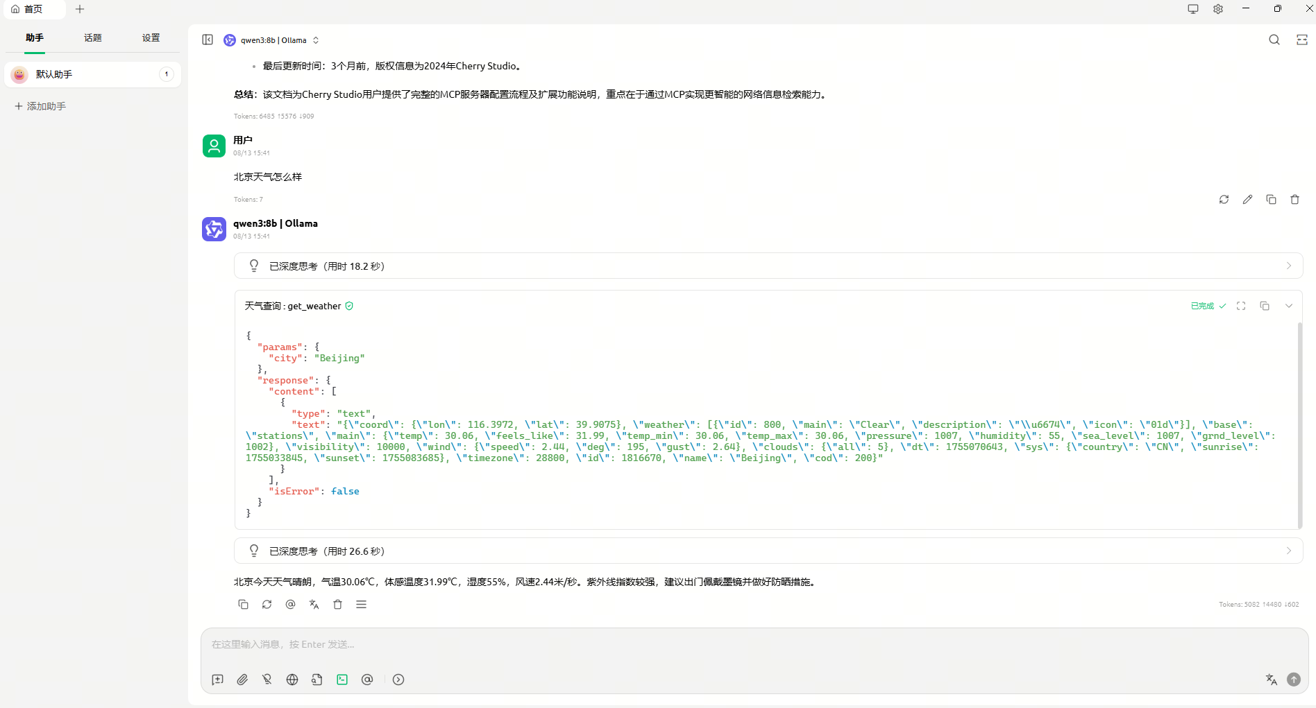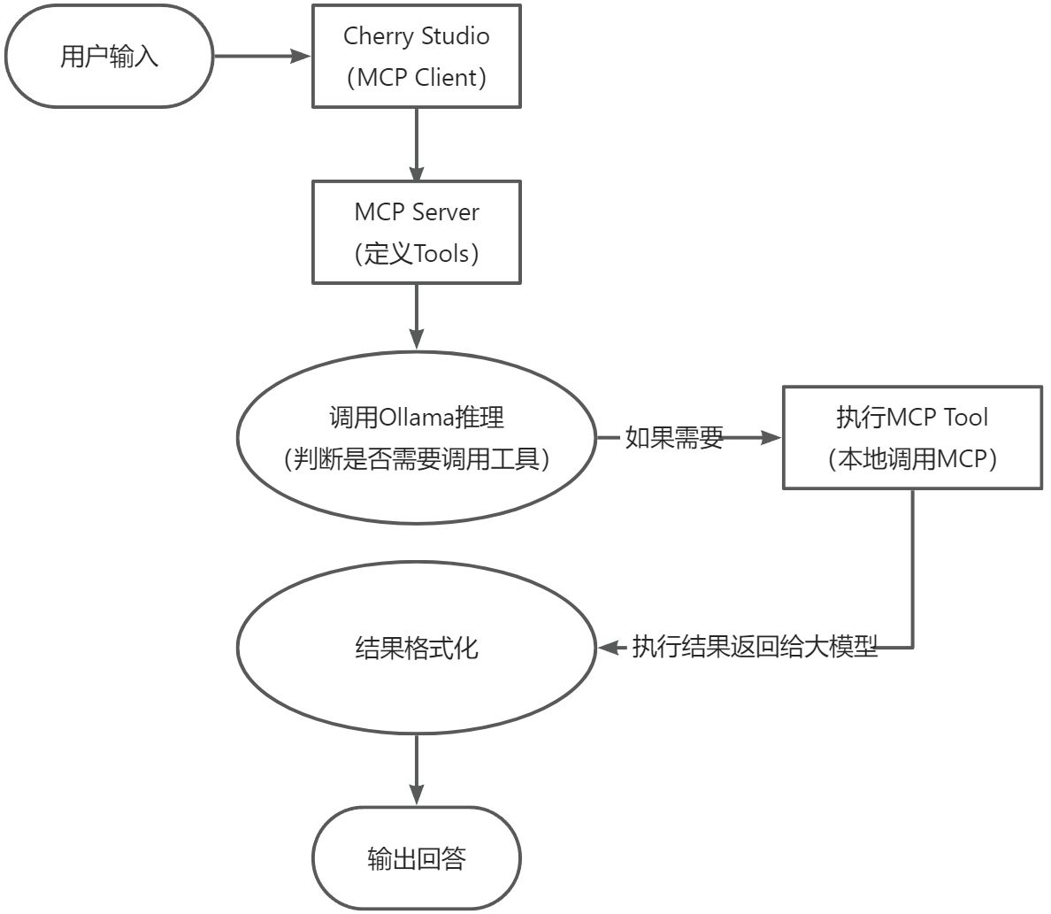 - Cherry Studio 收到输入后,并不会立刻把它丢给 Ollama,而是先通过 MCP Client 传递给 MCP Server。
