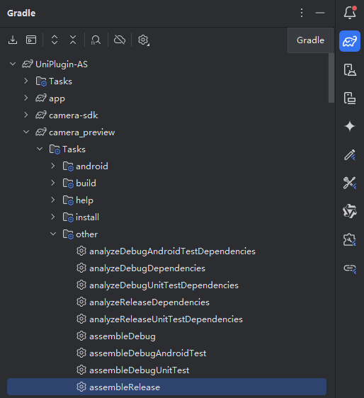 点击android studio右上角的gradle按钮,然后选择camera_preview下面的other中的assembleRelease, 双击开始打包