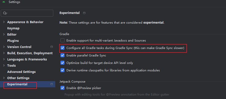 如果点开gradle后,在camera_preview下面没有发现other, 打开android studio 的settings, 选左边的Experimental,勾选红色的复选项。然后重启android studio