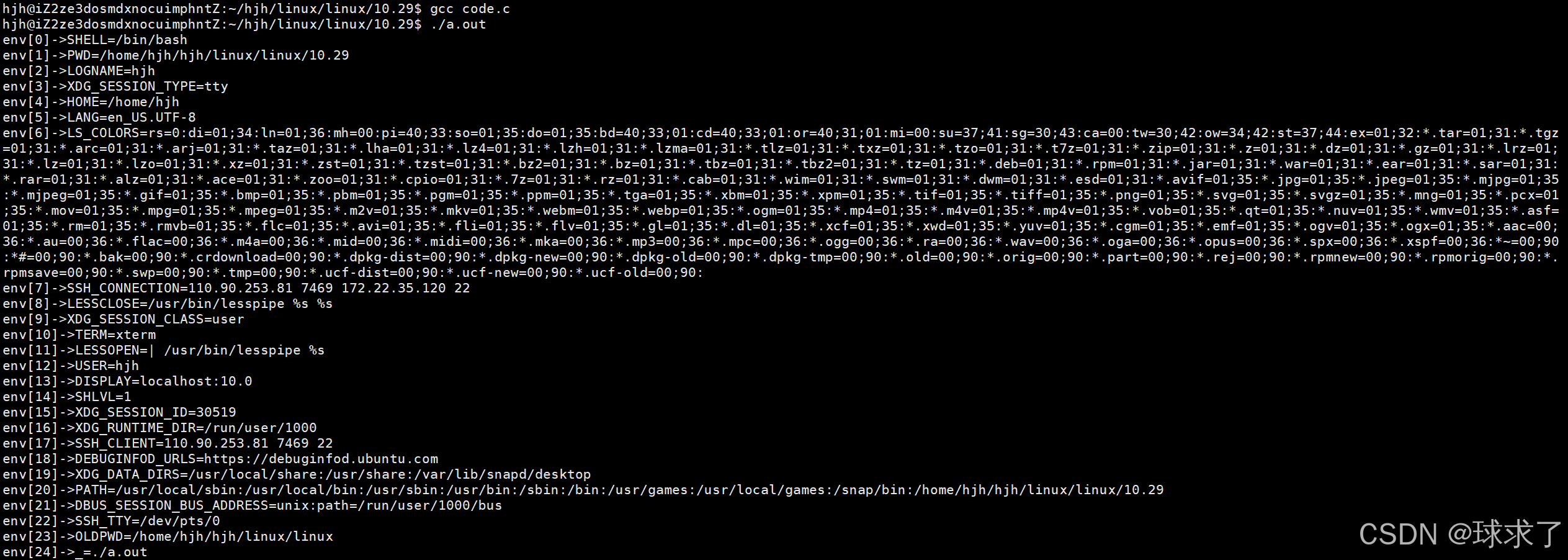 {for(int i=0;environ[i];i++){printf("env[%d]->%s\n",i,environ[i]);}return 0;