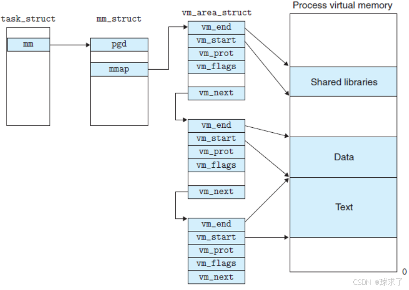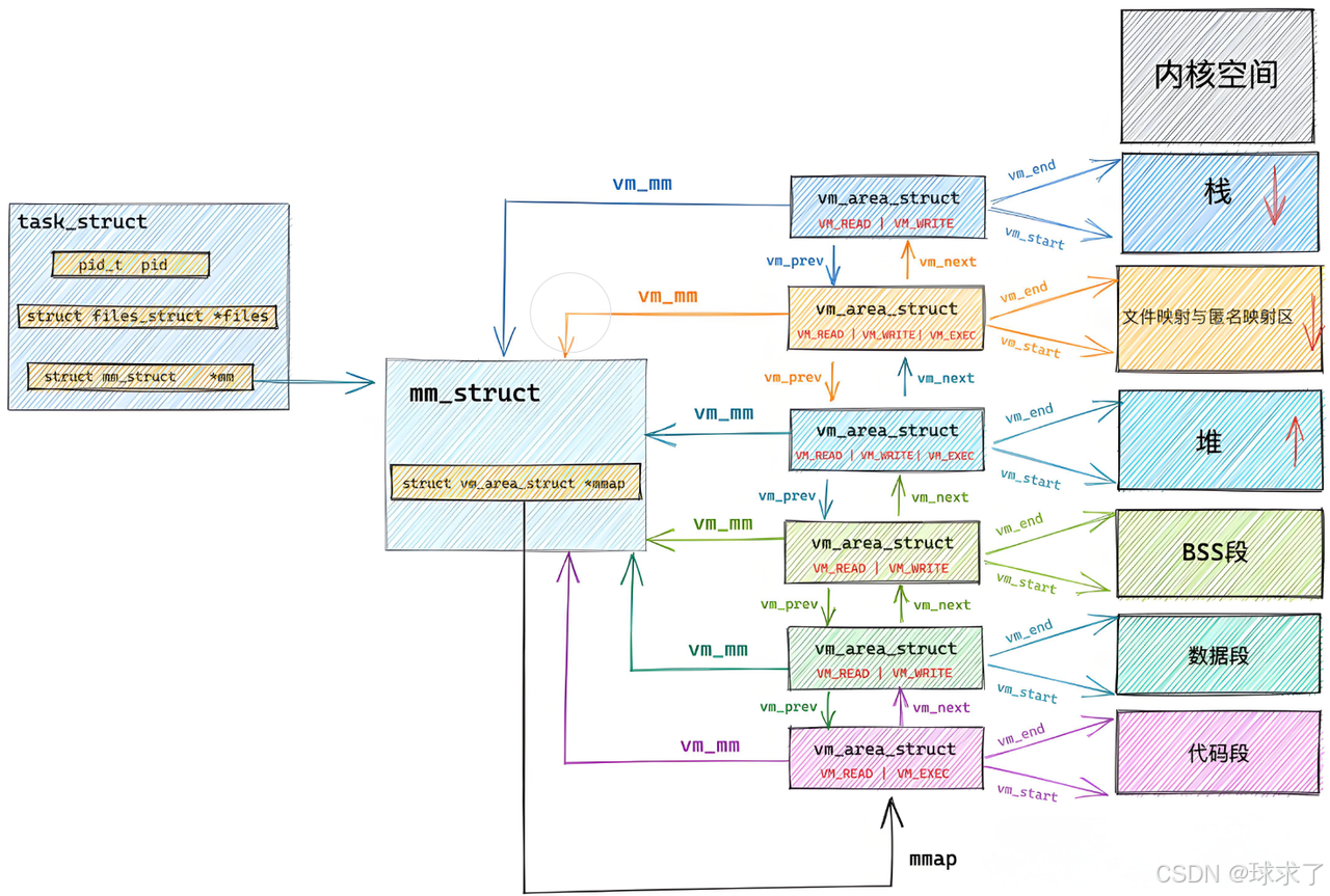 每个虚拟内存区域中也存有自己分区的起始位置和结束位置,还有一个mm_struct类型的指针,指向自己所属的mm_struct结构体。上图表示用双链表连接每个VMA。