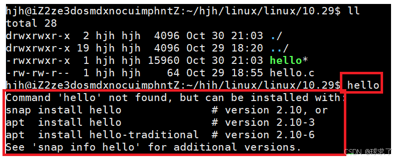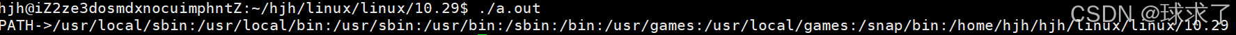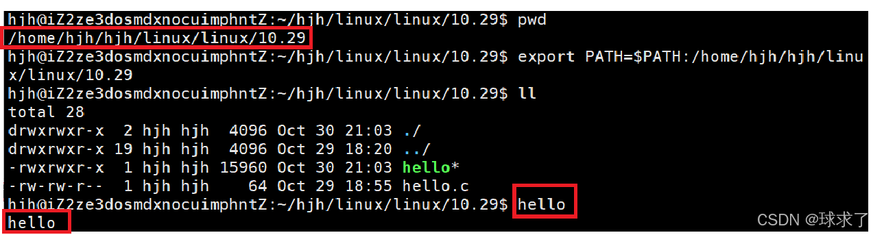 查看当前的PATH环境变量,发现当前工作目录没有在环境变量PATH中,所以只能使用./hello来执行程序。使用下列命令在PATH环境变量中添加当前工作目录使用 hello 直接运行程序,bash找不到文件。