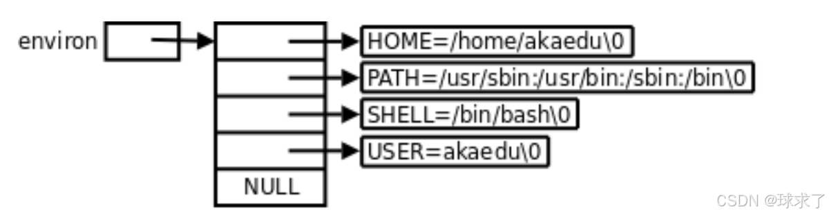 - bash进程启动时,会从系统中读取环境变量,形成一张环境变量表。也是一个字符指针数组,每个元素指向一个key - value 的环境变量长字符串。env查询的时候就是打印这张表中元素指向的内容。每个程序都会收到一张环境表,环境表是一个字符指针数组,每个指针指向⼀个以’\0’结尾的环境字符串