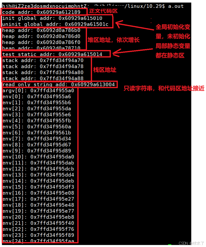 {const char *str = "helloworld";printf("code addr: %p\n", main);printf("init global addr: %p\n", &g_val);printf("uninit global addr: %p\n", &g_unval);static int test = 10;char *heap_mem = (char*)malloc(10);char *heap_mem1 = (char*)malloc(10);char *heap_mem2 = (char*)malloc(10);char *heap_mem3 = (char*)malloc(10);printf("heap addr: %p\n", heap_mem);printf("heap addr: %p\n", heap_mem1);printf("heap addr: %p\n", heap_mem2);printf("heap addr: %p\n", heap_mem3);printf("test static addr: %p\n", &test);printf("stack addr: %p\n", &heap_mem);printf("stack addr: %p\n", &heap_mem1);printf("stack addr: %p\n", &heap_mem2);printf("stack addr: %p\n", &heap_mem3);printf("read only string add: %p\n", str);for (int i = 0; i < argc; i++){printf("argv[%d]: %p\n", i, argv[i]);}for (int i = 0; env[i]; i++){printf("env[%d]: %p\n", i, env[i]);}return 0;