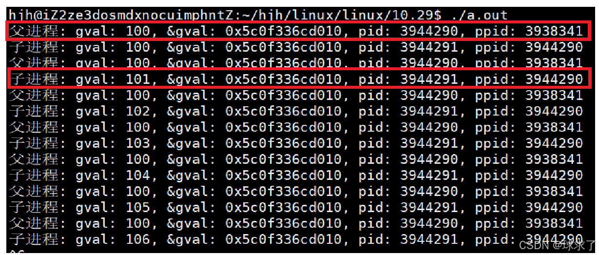 {pid_t id = fork();if (id == 0){while(1){printf("子进程: gval: %d, &gval: %p, pid: %d, ppid: %d\n", gval, &gval, getpid(), getppid());sleep(1);gval++;}}else{while(1){printf("父进程: gval: %d, &gval: %p, pid: %d, ppid: %d\n", gval, &gval, getpid(), getppid());sleep(1);}}return 0;