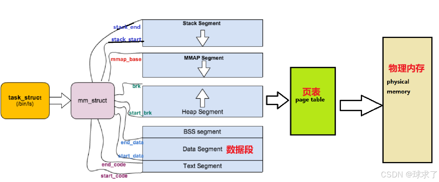 {/*...*/struct vm_area_struct *mmap;    /* 指向虚拟区间(VMA)链表 */struct rb_root mm_rb;    /* red_black树 */unsigned long task_size;    /*具有该结构体的进程的虚拟地址空间的⼤⼩*//*...*/// 代码段、数据段、堆栈段、参数段及环境段的起始和结束地址。unsigned long start_code, end_code, start_data, end_data;unsigned long start_brk, brk, start_stack;unsigned long arg_start, arg_end, env_start, env_end;/*...*/