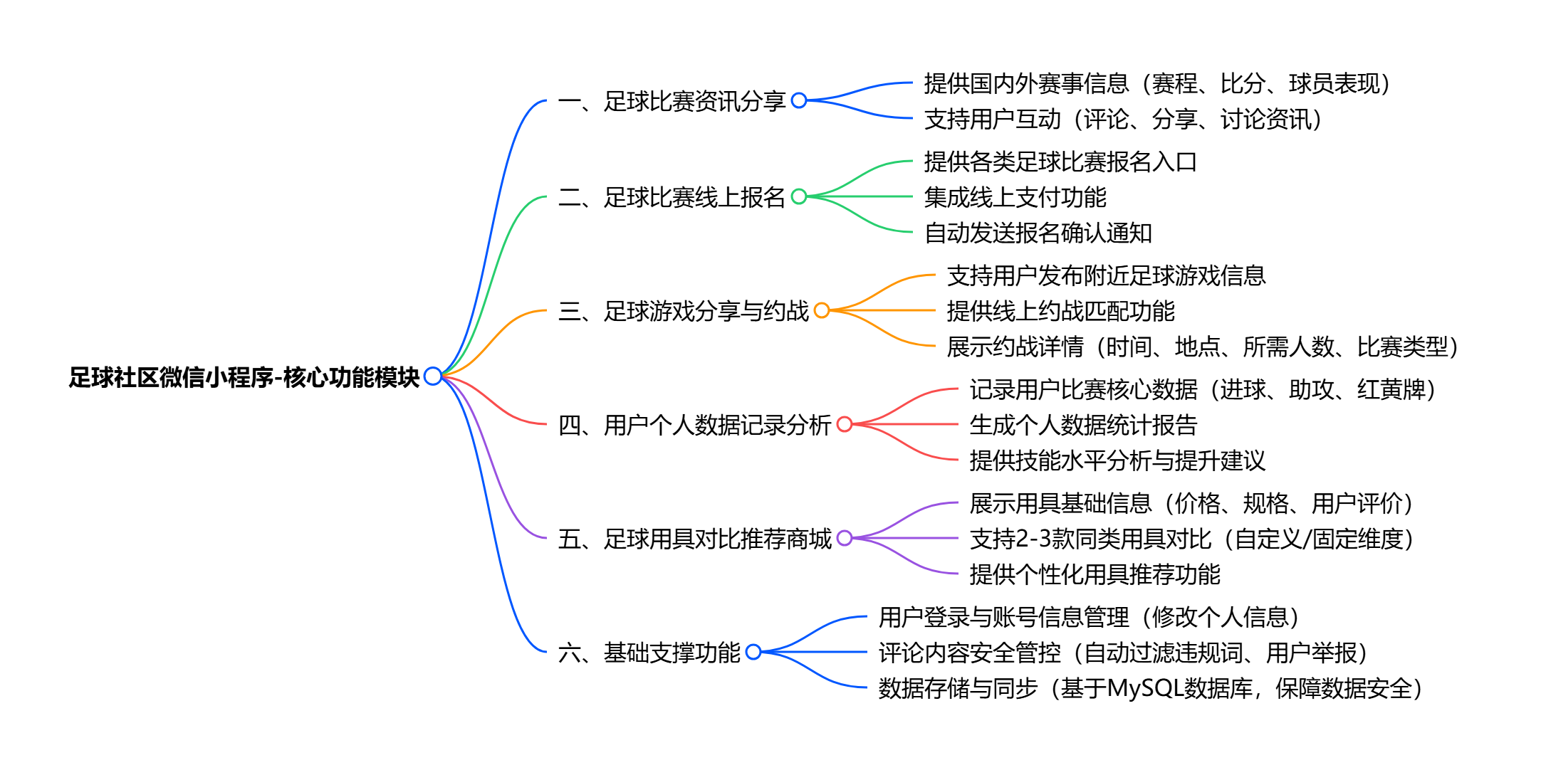 该微信小程序围绕足球爱好者需求设计,核心功能涵盖五大板块: