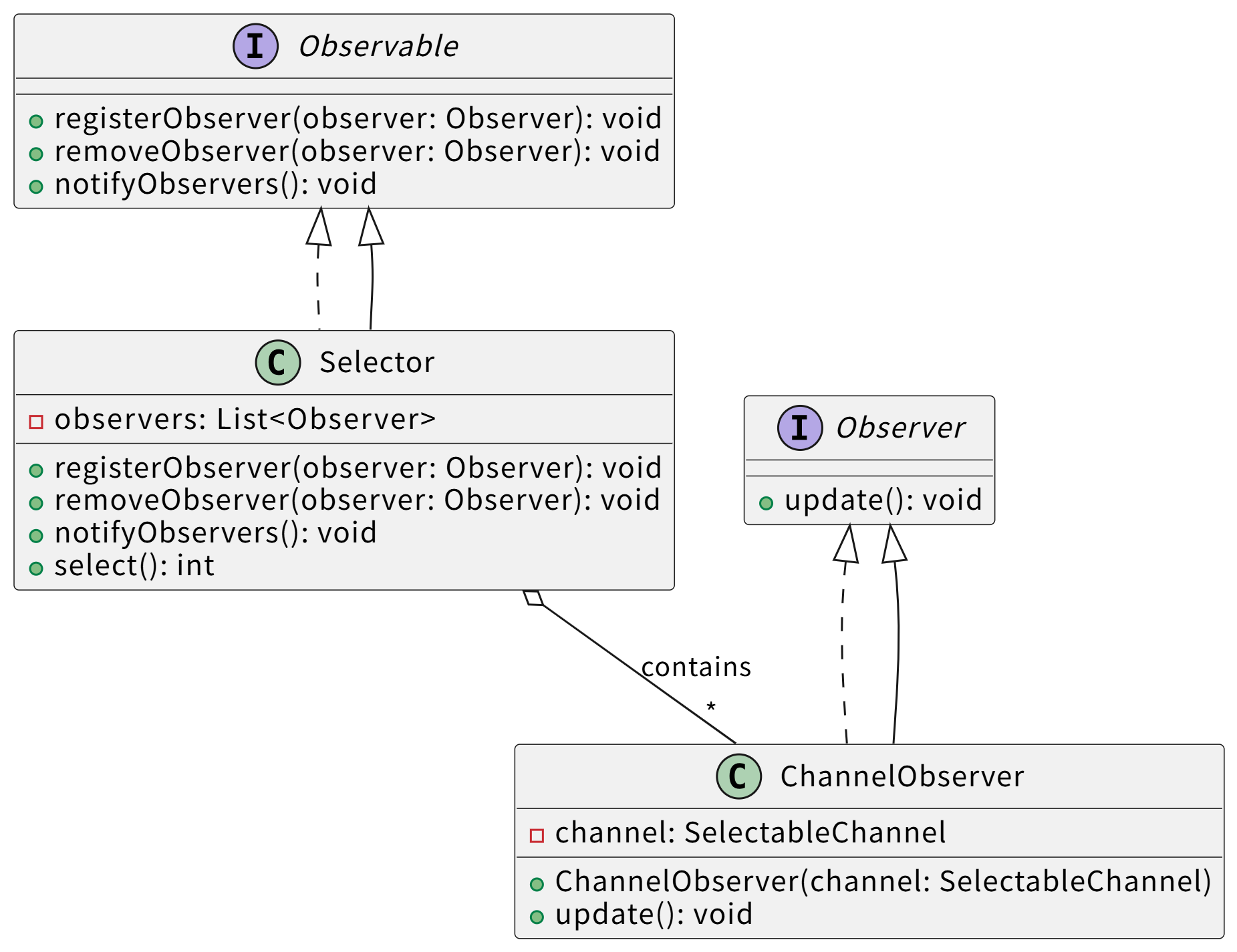 interface ChannelObserver {void onEvent(); // 事件发生时回调SelectableChannel getChannel(); // 获取观察的通道