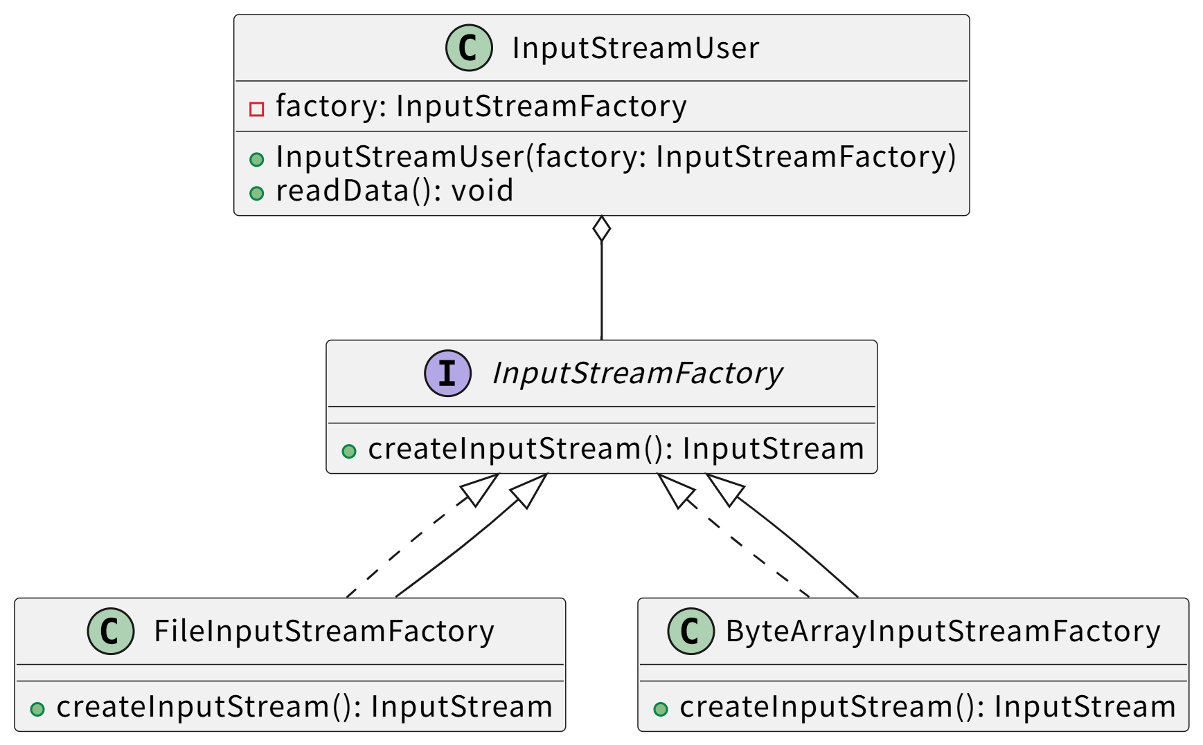 class DataProcessor {private InputStreamFactory factory;// 依赖注入:通过构造函数传入具体工厂public DataProcessor(InputStreamFactory factory) {this.factory = factory;}public void process() throws IOException {try (InputStream is = factory.createInputStream()) {byte[] buffer = new byte[1024];int len;while ((len = is.read(buffer)) != -1) {// 处理数据...System.out.println("读取到 " + len + " 字节数据");}}}