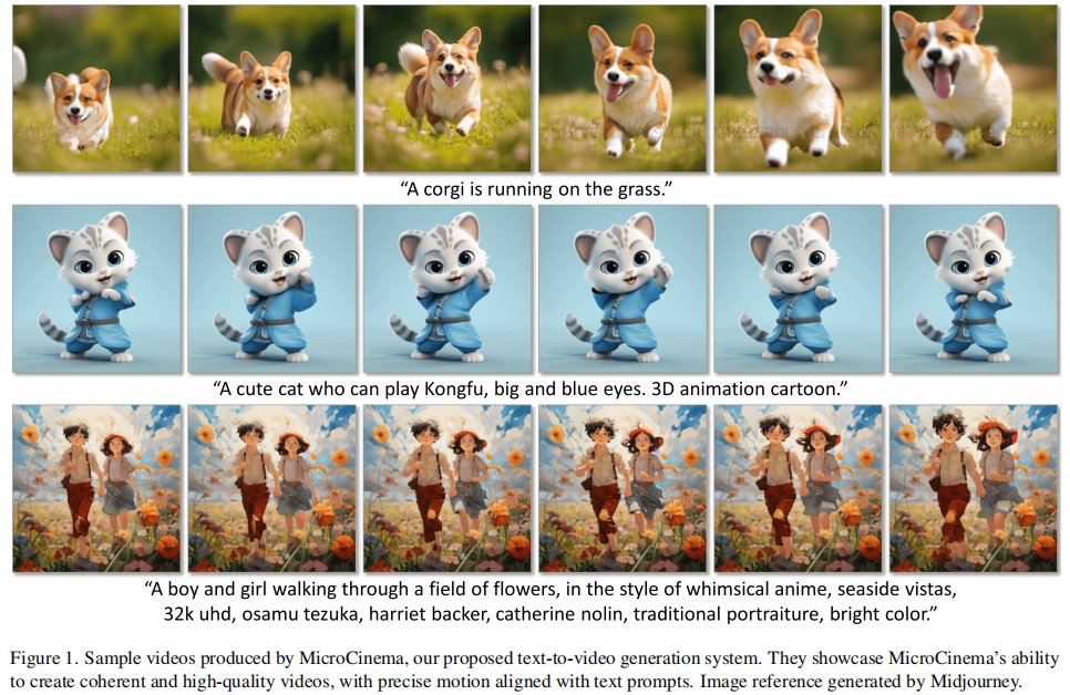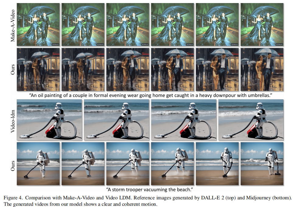 论文通过可视化对比,直观展示了 MicroCinema 与主流模型(Make-A-Video、Video LDM、Imagen Video)的差异,部分结果如图 4 所示。
