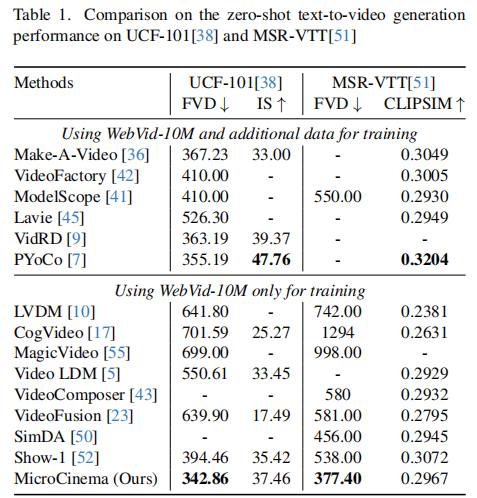 论文将 MicroCinema 与两类模型对比:使用额外数据训练的模型(如 Make-A-Video、PYoCo)与仅使用 WebVid-10M 训练的模型(如 CogVideo、Show-1),结果如下表所示。