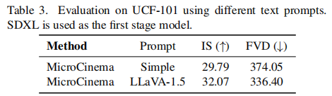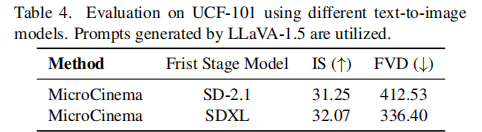 - 第一阶段模型的影响:对比 SD 2.1 与 SDXL 作为第一阶段模型的效果(表 3),发现 SDXL 生成的关键帧能让 MicroCinema 的 FVD 从 412.53 降至 336.40,IS 从 31.25 升至 32.07,证明高质量关键帧是提升视频质量的基础。