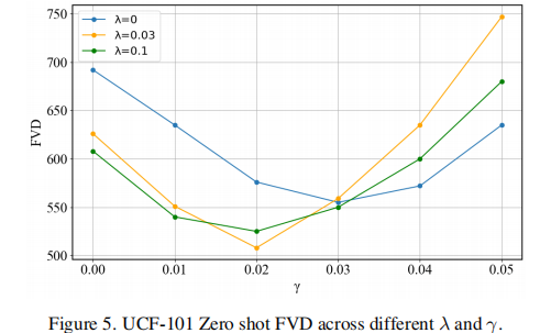 - 外观噪声先验的必要性:移除该模块后,FVD 升至 692,IS 降至 18.5,说明修改噪声分布能有效保留预训练文本到图像模型的外观生成能力。