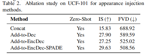 从表中可见,AppearNet 的最终设计(Add-to-EncDec-SPADE)取得了最低的 FVD(508.56)与最高的 IS(29.63),证明多尺度 + 去归一化的注入策略能最有效地保留外观一致性。