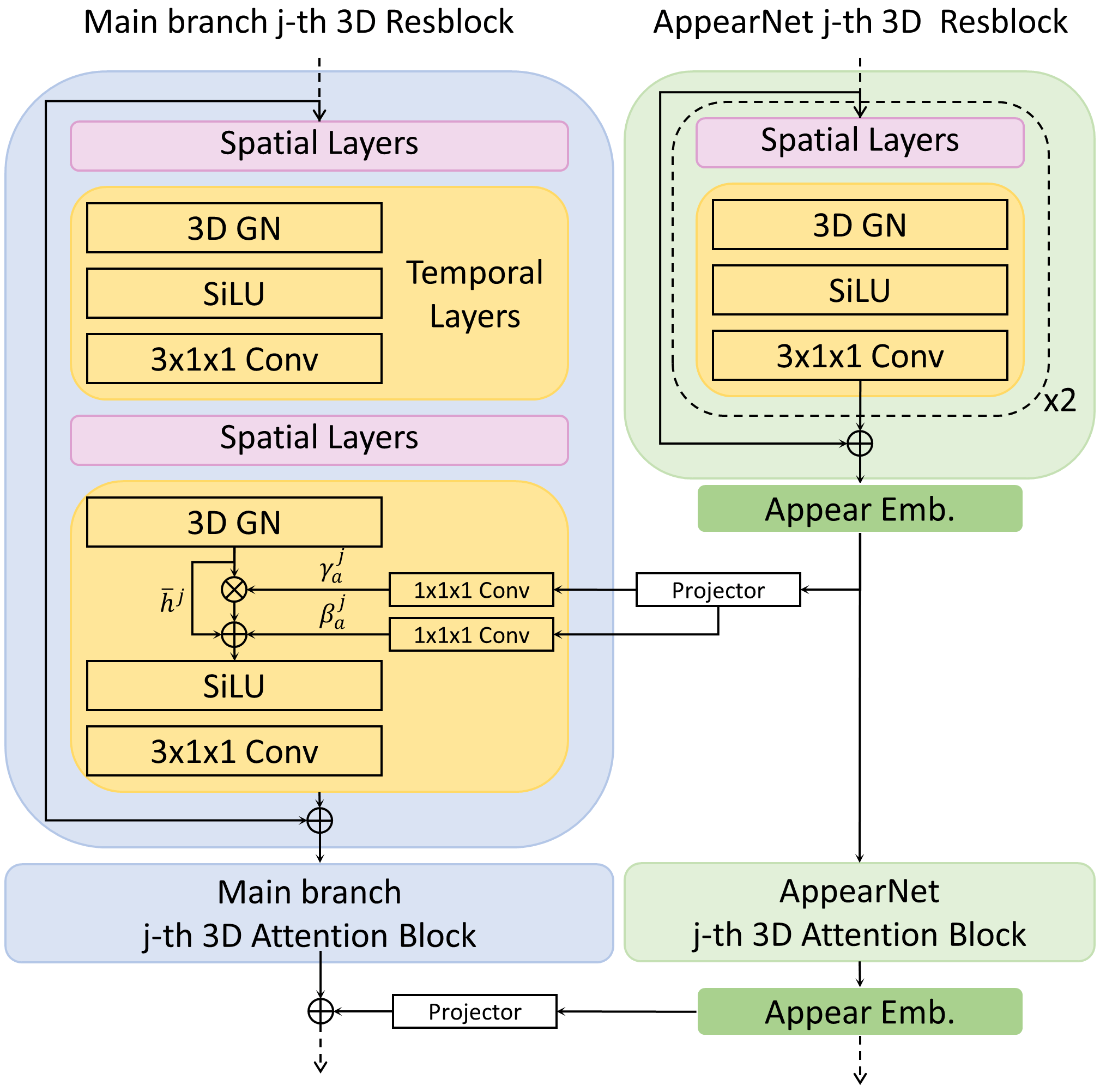 为解决 “帧间外观不一致” 问题,论文设计了AppearNet,其核心功能是将中心帧的外观信息 “注入” 到 3D U-Net 的编码与解码过程中,强制模型在生成视频时保留关键帧的视觉特征(如物体形状、颜色、纹理)。
