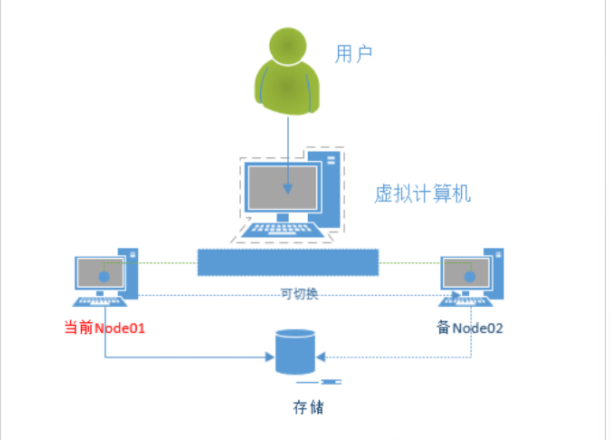 High availability Cluster高可用群集,简称HAC ;主要用于高可用解决方案的实现,节点间以主备形式,实现容灾;在大型故障(宕机,服务器故障)的情况下实现快速恢复,快速提供服务。如下图所示:当前节点在Node01,所有业务在Node01上运行,若发生故障服务和资源会转移到Node02上。高可用集群的另外一个特点是共享资源,多个节点服务器共享一个存储资源,该存储可在不同节点之间转移。