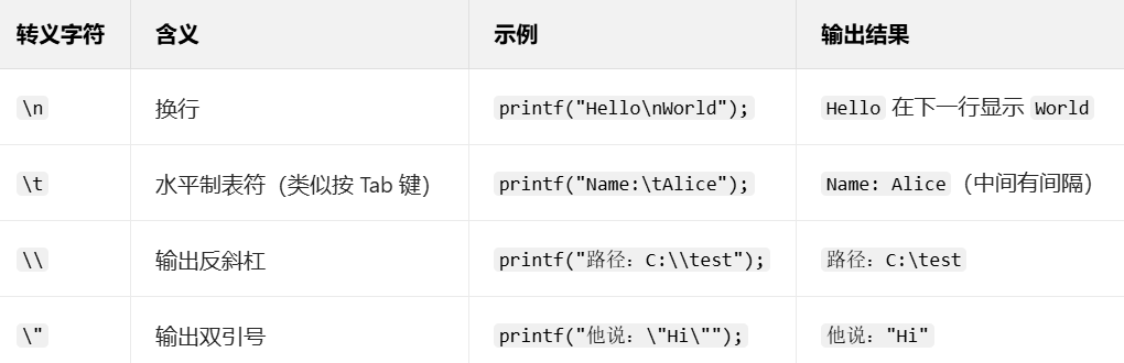 -  转义字符:用于输出特殊符号(如换行、制表符等)