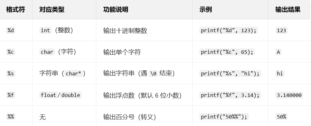 “格式化” 是 printf 的核心能力,通过格式控制符指定数据的输出形式,常见控制符如下:
