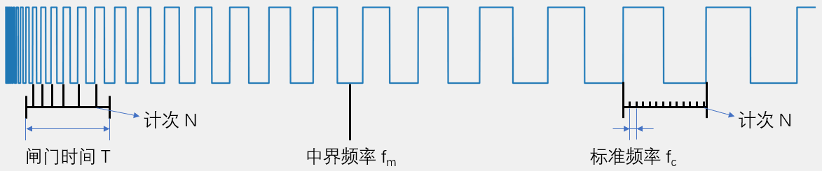 2.测频法:在闸门时间T内,对上升沿计次,得到N,则频率。(𝑓𝑥=𝑁 / 𝑇f_x=N / T)(适合频率高一点)