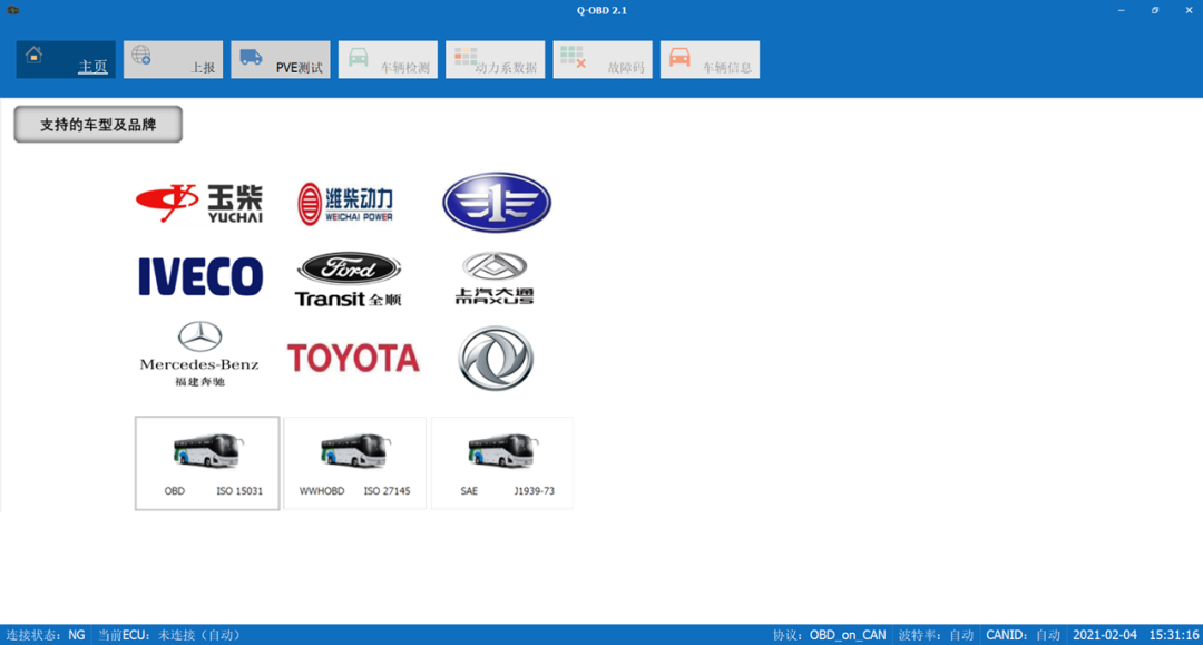 目前Q-OBD已在国内几家知名厂商中被投入使用。实车测试了多种客车、房车以及高端商务车约1800辆,并已确认支持的品牌有玉柴、潍柴、大柴、国产依维柯、进口依维柯、江铃全顺、上汽大通、福建奔驰、东风、金田、金杯、五十铃和丰田等。