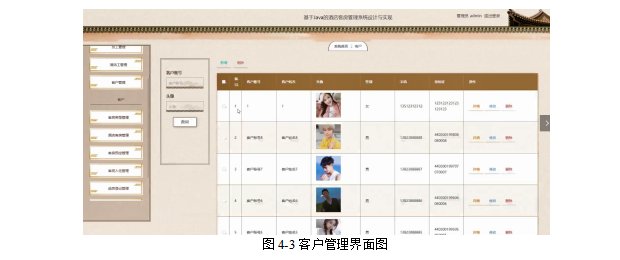 管理员点击客户管理;在客户管理页面对客户账号、客户姓名、头像、性别、手机、身份证等信息,进行查询,新增或删除客户信息等操作;如图4-3所示。