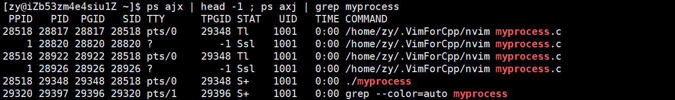 我们也可以使用 ps ajx | head -1 ; ps axj | grep myprocess 指令,先打印列名,方便我们查看。其中分号用于分割两条指令,用于同时执行,也可以使用 && 来代替 ;