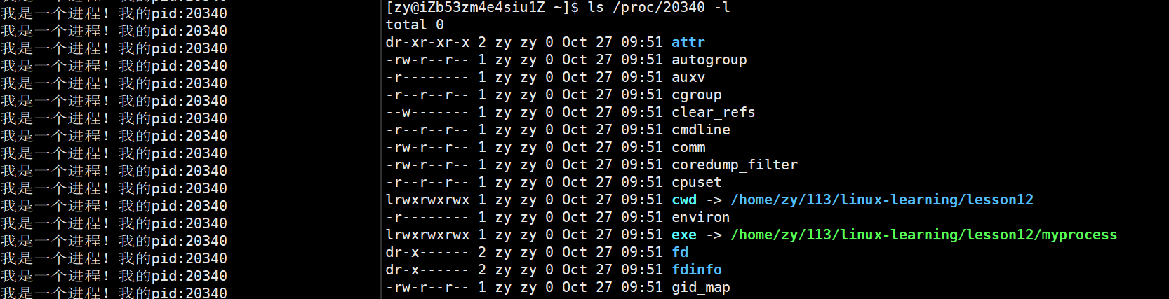 我们的proc目录里记录的是当前系统里所有进程信息,其中的数字目录是不同进程的pid,每个数字目录中的内容包含的是将来该进程的动态属性,进程一旦退出,该目录会被自动移除。同理,当我们创建进程时,相应的数字目录也会被同时创建出来。