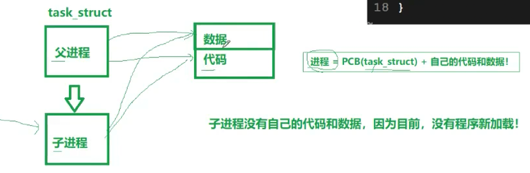 我们知道进程 = PCB(task_struct) + 自己的代码和数据,如果我们创建了子进程,系统中就会多一个进程,而每个子进程都要有自己的PCB和代码数据,子进程会默认拷贝父进程的PCB并指向父进程指向的代码数据,也就是说有人抄了你的简历,只是改了个名字,连电话都没改,所以子进程会继续向下执行,而不是回到最开始去执行。换句话说,子进程没有自己的代码和数据,因为目前没有程序新加载!
