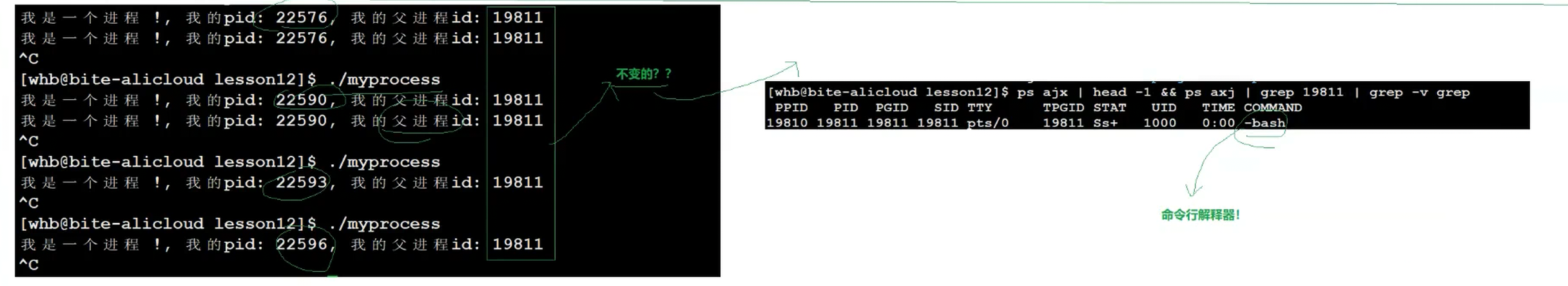 所以命令行解释器(王婆)也是一个进程,其实我们在每一次登录云服务器时,操作系统会给每一个用户分配一个bash。bash这个进程启动后,会现在命令行上打印,然后进行scanf,这样就会停下来接收下一条用户输入的指令,bash拿到字符串后就可以开始进行分析了。