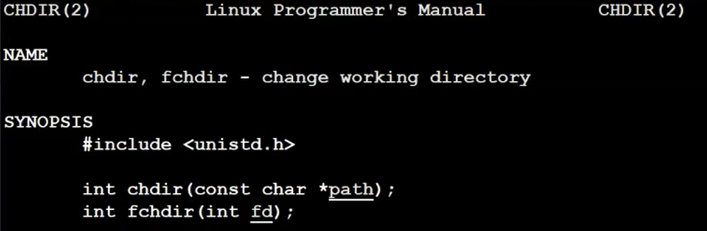 如果你想要更改当前文件的所处路径,可以使用chdir(Change Directory):使用man chdir可以查看使用文档。
