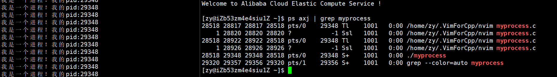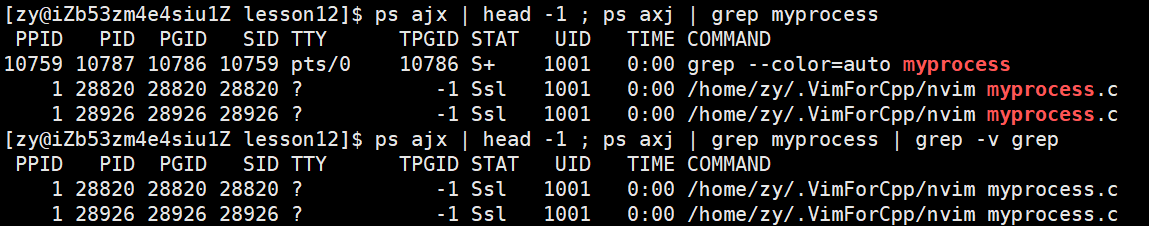 在打印信息的最后一行,我们可以看到有一个grep命令,原因是在使用ps axj 对进程进行过滤时,grep也执行了筛选文件功能,此时grep也是一个进程,同时它本身就存在myprocess这个关键词,所以也会被打印出来。如果你不想显示grep行,可以在上面命令基础上补充指令:| grep -v grep即可。
