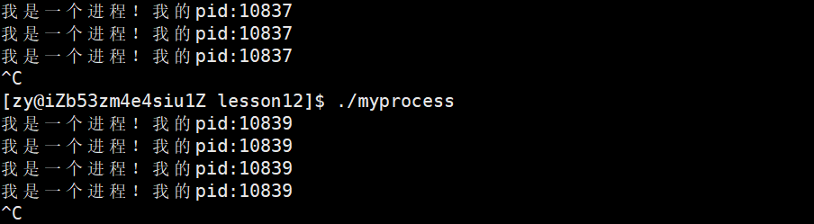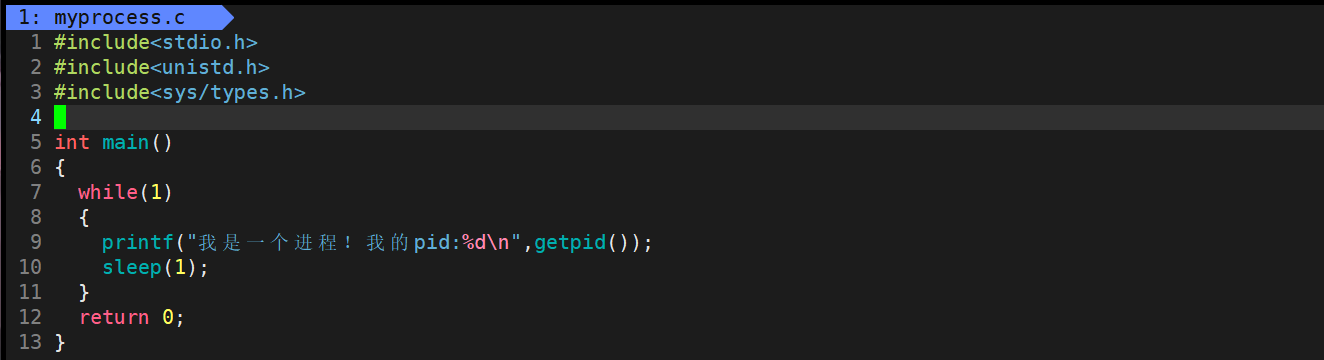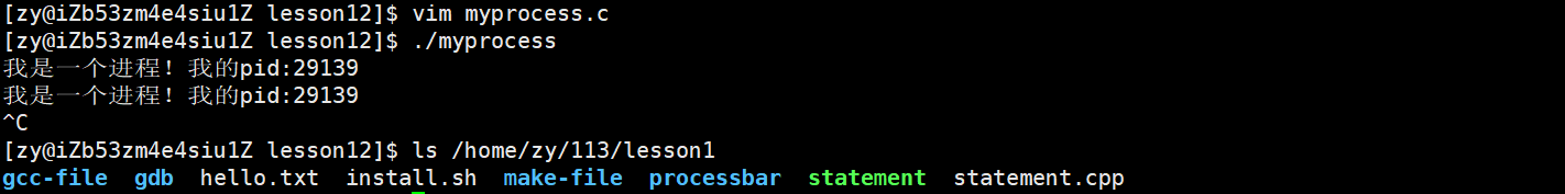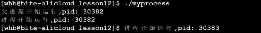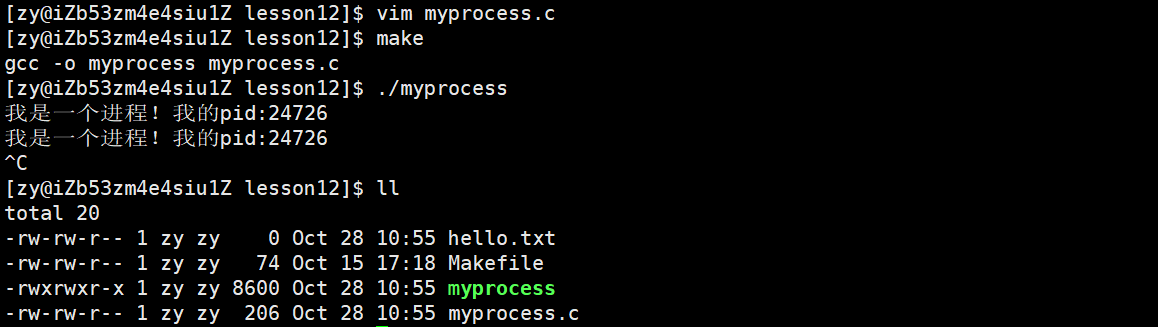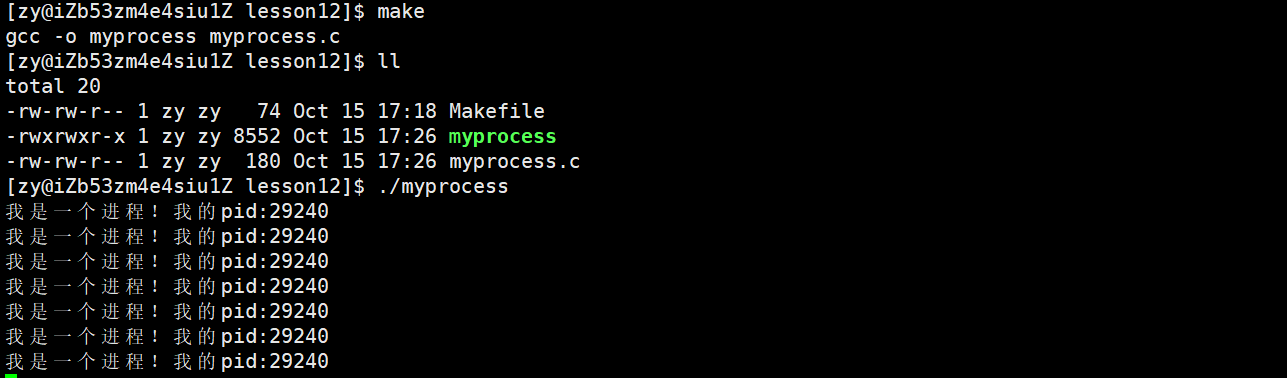 执行make指令后,运行myprocess,我们可以看到当前程序的pid: