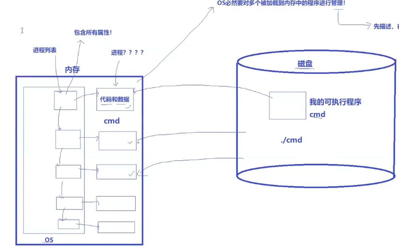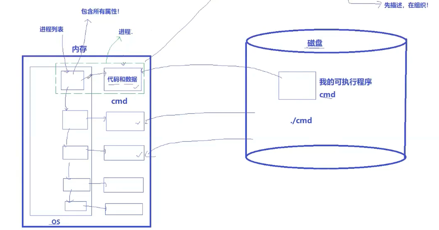 上面只是一个程序被加载到内存,如果同一时刻,有上百个程序全部被加载到内存中呢?其实在我们还没有加载这么多程序的时候,OS已经被启动了。当多个程序被同时加载到内存中时,他们都需要申请内存、释放内存甚至进程本事需要被管理调度,而操作系统也无法识别不同的程序并同时管理多个程序,但是操作系统必然要对所有加载的程序进行管理。所以操作系统为了管理加载进来的代码和数据,基于"先描述、在组织"的方式构建了struct结构体,结构体中包含了OS管理程序代码和数据所需要的全部信息,所有加载到内存中程序的struct结构体会在内存中通过链表的形式被排列起来,称之为进程列表。