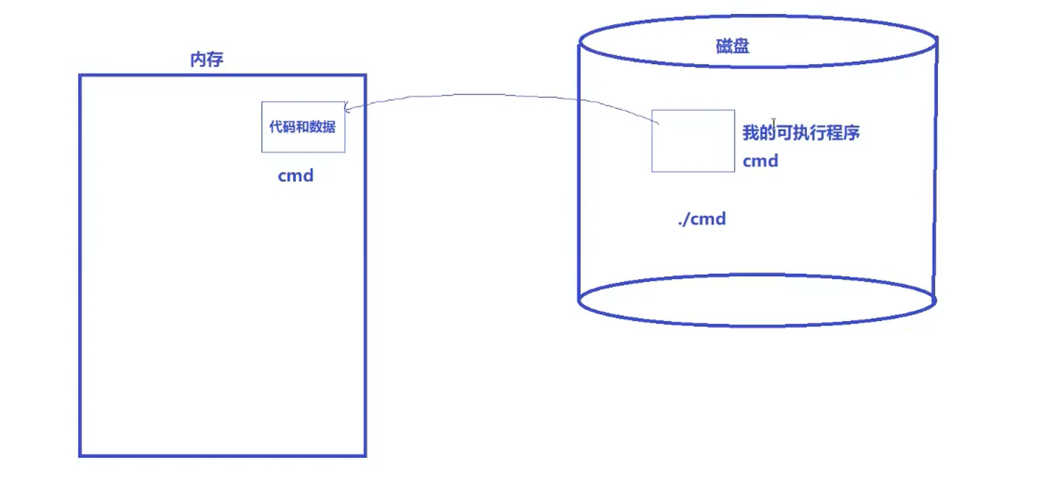 但是这样说你可能并不是很明白。一个程序运行起来后叫进程,如果一个程序没运行起来,这个程序在哪呢?根据我们目前的认识,我们知道当我们自己编译好了一个可执行程序cmd,它本质上就是一个二进制文件,根据我们之前对冯诺依曼的学习可知,在没有运行之前,它都是我们磁盘上的一个文件罢了,后来我们想运行这个程序,就得先加载到内存,为什么要加载?因为体结构这么决定的。下图内存中就是我们cmd这个程序的代码和数据,其中我们写的for循环等就是代码,我们定义的变量等就是数据,这个是我们所说的进程吗?其实并不是。