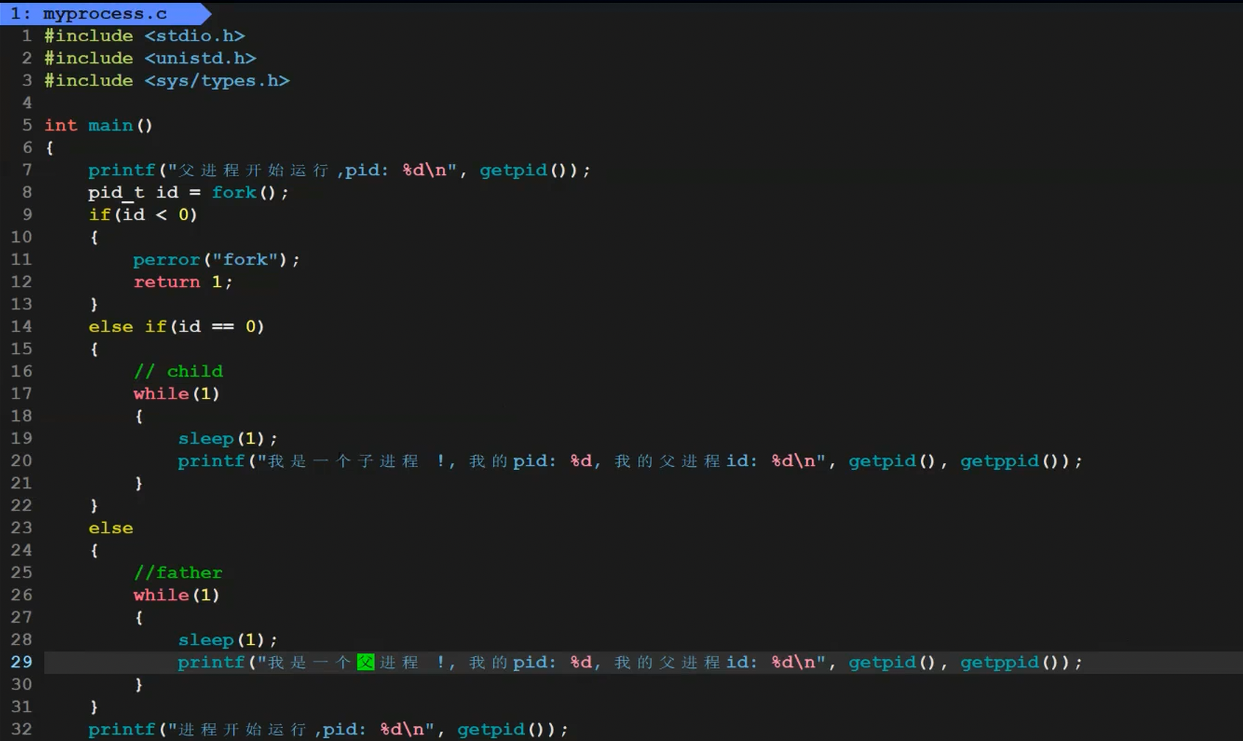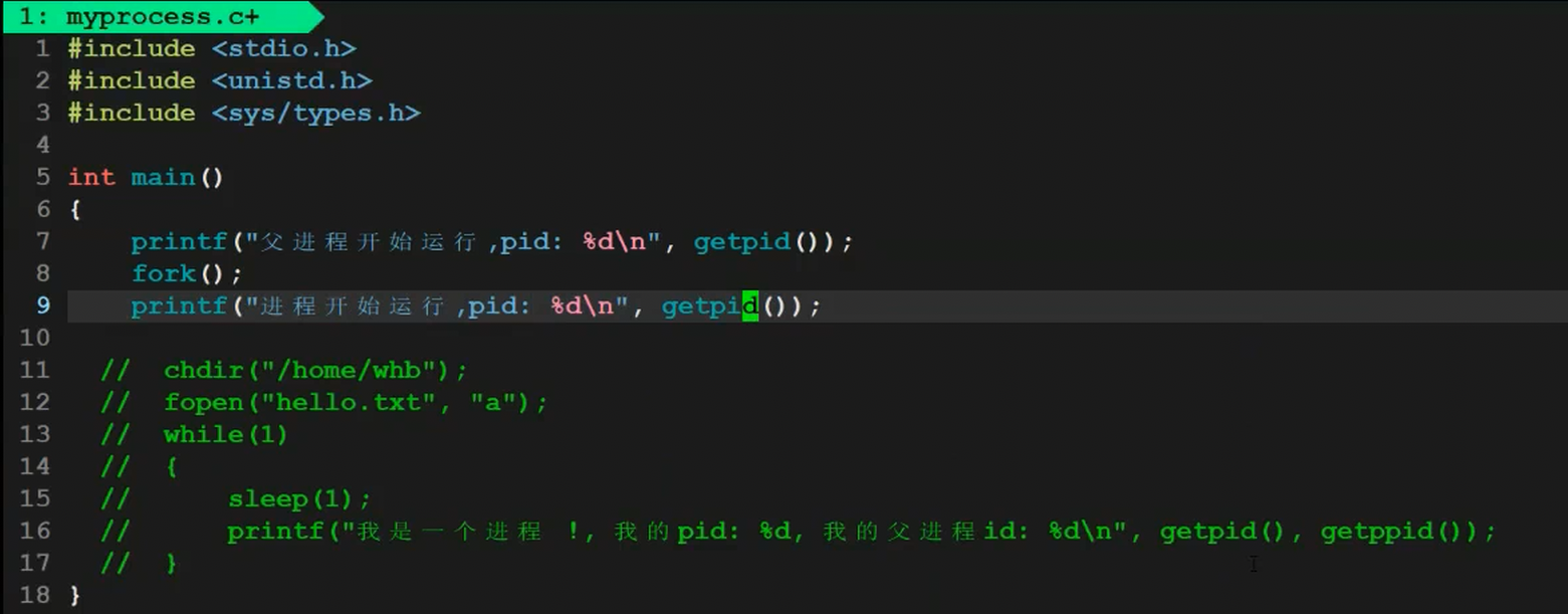 我们将代码做如下修改,使用id变量接收fork的返回值,并进行分支语句判断是父进程还是子进程。
