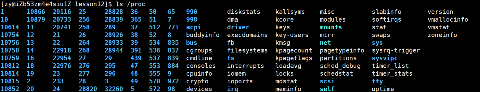除了 ps 命令,我们也可以在proc目录中查看到所有进程,proc是process的简写,说白了就是你现在是在通过文件的方式在查看进程,操作系统不仅可以把磁盘上的文件让你用指令查到,它把内存上的数据也通过文件的形式给你呈现出来,让你能够动态看到内存相关的数据,proc就是内存级的文件系统,它和磁盘没有任何关系,所有数据都是内存上的数据,这也符合linux上一切皆文件的观点,linux甚至把每个进程都转换成了对应的文件。我们知道这些蓝色文件都是目录,而这些目录的命名就是特定进程的pid。