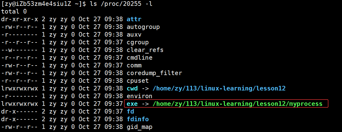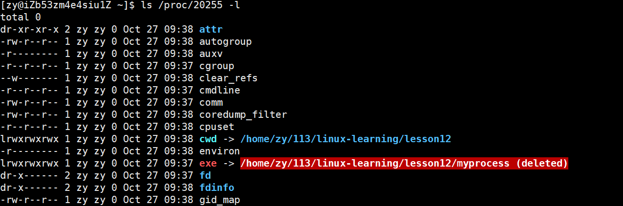 当我们再次运行ls /proc/20255 -l,你会发现这个exe就开始报警告了。它再告诉我们,进程虽然还在,但是文件已经被delete了。