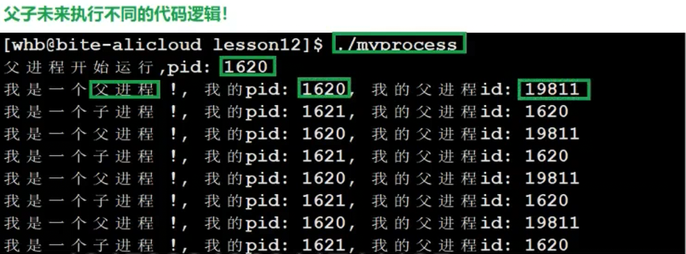 在id接收到返回值时,子进程也已经被创建了,下面父进程和子进程就会继续往下运行,父进程的id>0,所以会进入else里面循环,而子进程则会进入到id==0的函数体中循环,最终就呈现出了上图中的结果。