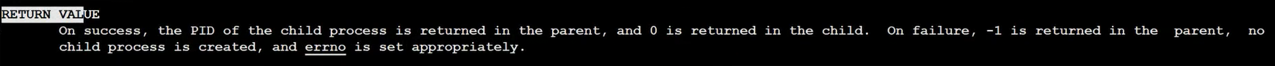 fork的返回值解释为:如果成功,返回父进程返回子进程的pid,子进程返回0;如果失败,父进程会返回-1,子进程没有返回值并报错。也就是说,fork会有两个返回值。