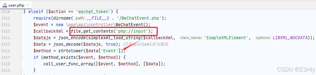从php://input中获取xml数据,并解析,从中取出Event字段作为$method